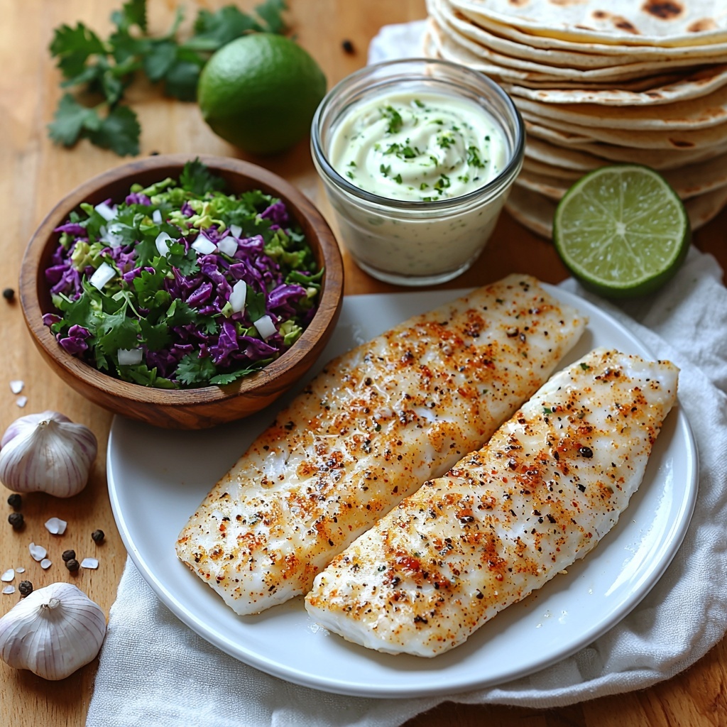4. Make the Cilantro Lime Slaw: While the fish cooks, combine cole slaw mix, mayonnaise, lime juice, minced garlic, chopped cilantro, sugar (if using), sea salt, and cracked pepper in a bowl. Mix well and adjust seasoning or lime juice to your preference.