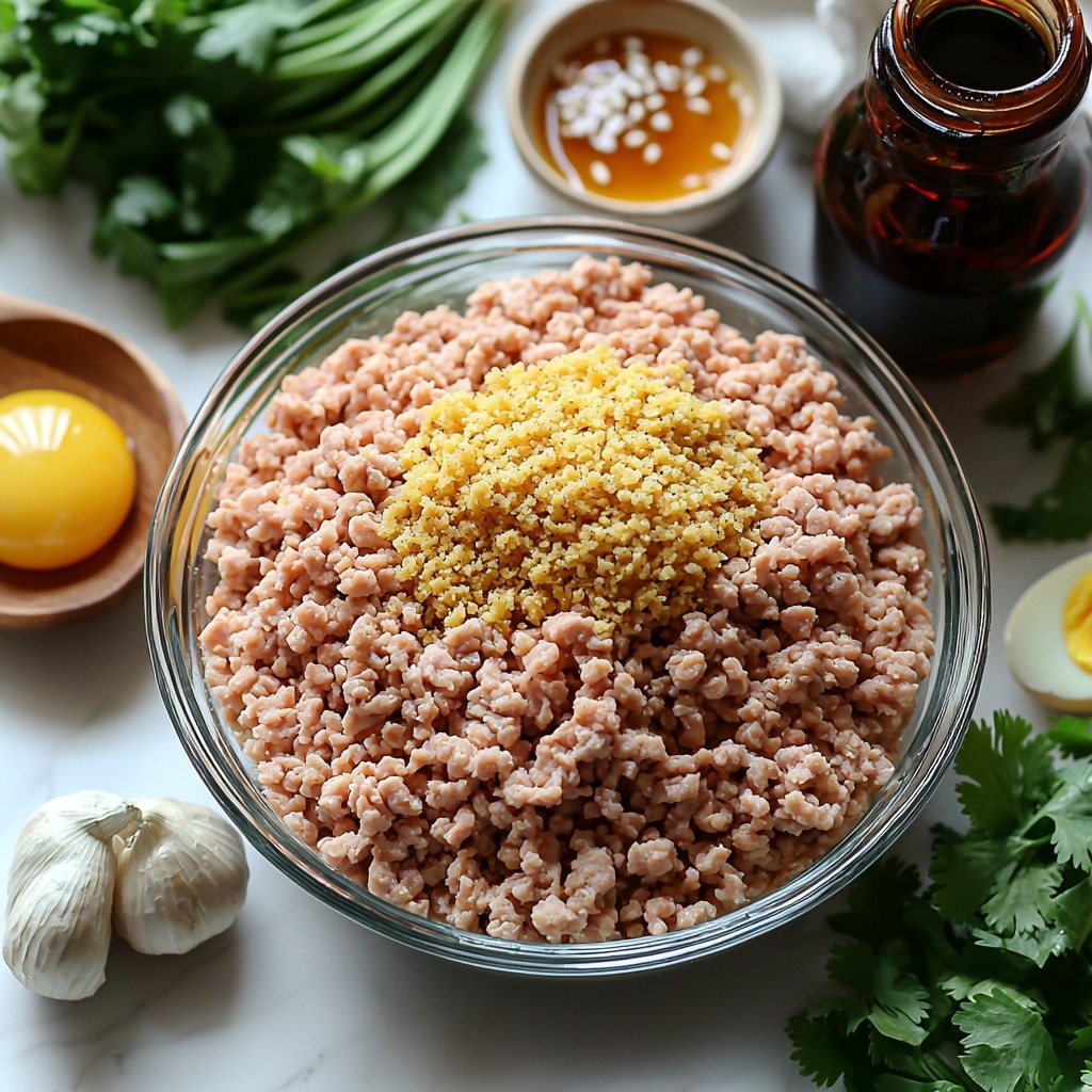 - Mix Ingredients: In a large mixing bowl, combine the ground chicken, breadcrumbs, finely chopped green onions, minced garlic, grated fresh ginger, soy sauce, sesame oil, salt, black pepper, and the egg. Mix gently but thoroughly to evenly distribute the ingredients without making the mixture tough.