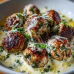 Enjoy a delicious and comforting dish of Baked Chicken Ricotta Meatballs paired with a creamy Spinach Alfredo Sauce. Tender ground chicken meatballs blended with ricotta, Parmesan, and Italian herbs are baked to perfection and served with a rich Alfredo sauce infused with fresh spinach and melted mozzarella. This recipe balances protein and creamy textures for a satisfying family meal.