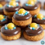 - Add pastel candies: Remove the baking sheet from the oven and immediately press one pastel candy coated chocolate or mini chocolate egg into the center of each softened chocolate piece, forming a button shape.