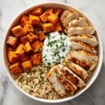 This Chicken Sweet Potato Bowl is a nutritious and easy high-protein meal featuring roasted sweet potatoes, seared chicken breast, and wholesome brown rice, all topped with a creamy Greek yogurt tahini sauce. Perfect for a balanced lunch or dinner, it combines savory flavors and satisfying textures in one bowl.