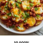 Finish your Chili Cheese Potato Skillet: A Delicious Meal Idea! Recipe with a handful of chopped green onions sprinkled on top. This adds a fresh, crisp bite and a touch of vibrant green color that brightens the whole dish on the plate.
