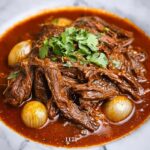 After the beef has cooked and is irresistibly tender, remove it from the pot and shred it using forks. Return the shredded beef to the sauce, allowing it to soak and infuse even more flavor. If you like, add some sliced onions at this point to bring a subtle sweetness and slight crunch to the dish before serving.