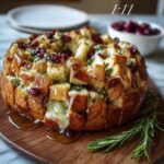 This Cranberry Goat Cheese Sourdough recipe features a rustic sourdough loaf sliced but left whole for easy pull-apart eating. The loaf is generously filled with creamy, tangy goat cheese, sweet dried cranberries, crunchy nuts, and fragrant fresh thyme, then baked until warm and golden. A final drizzle of honey adds a lovely touch of sweetness, perfect as a comforting appetizer or snack.