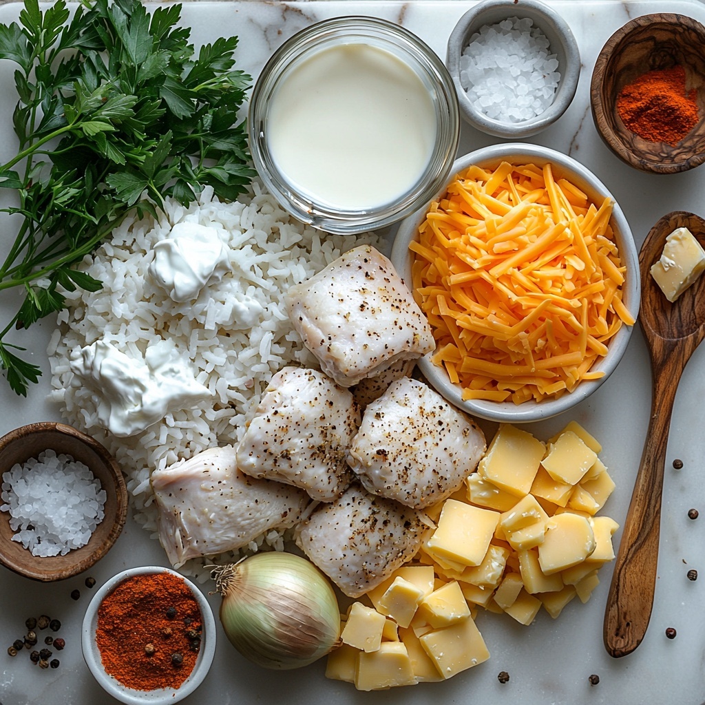 These ingredients are straightforward yet essential to building the hearty, creamy, and flavorful profile of this dish. Each component plays a vital role—from the tender chicken thighs or breasts to the creamy broth that brings everything together with irresistible richness.