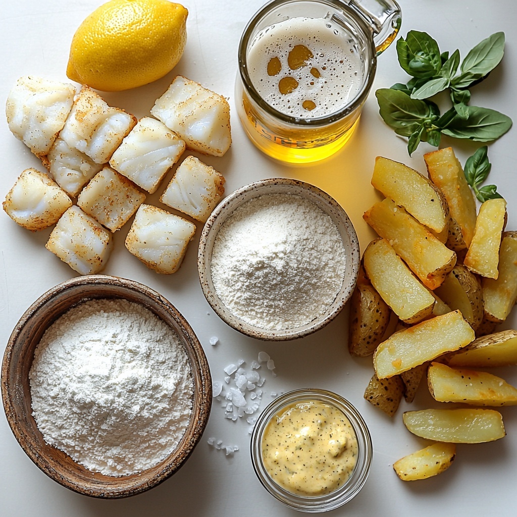 The magic behind this Crispy Beer Battered Fish and Chips (Pub-Style Recipe) Recipe lies in its simplicity. Each ingredient plays a vital role — from the beer that gives the batter its light, airy crunch to the russet potatoes that become perfectly crisp with a two-step frying method. Here’s what you’ll need: