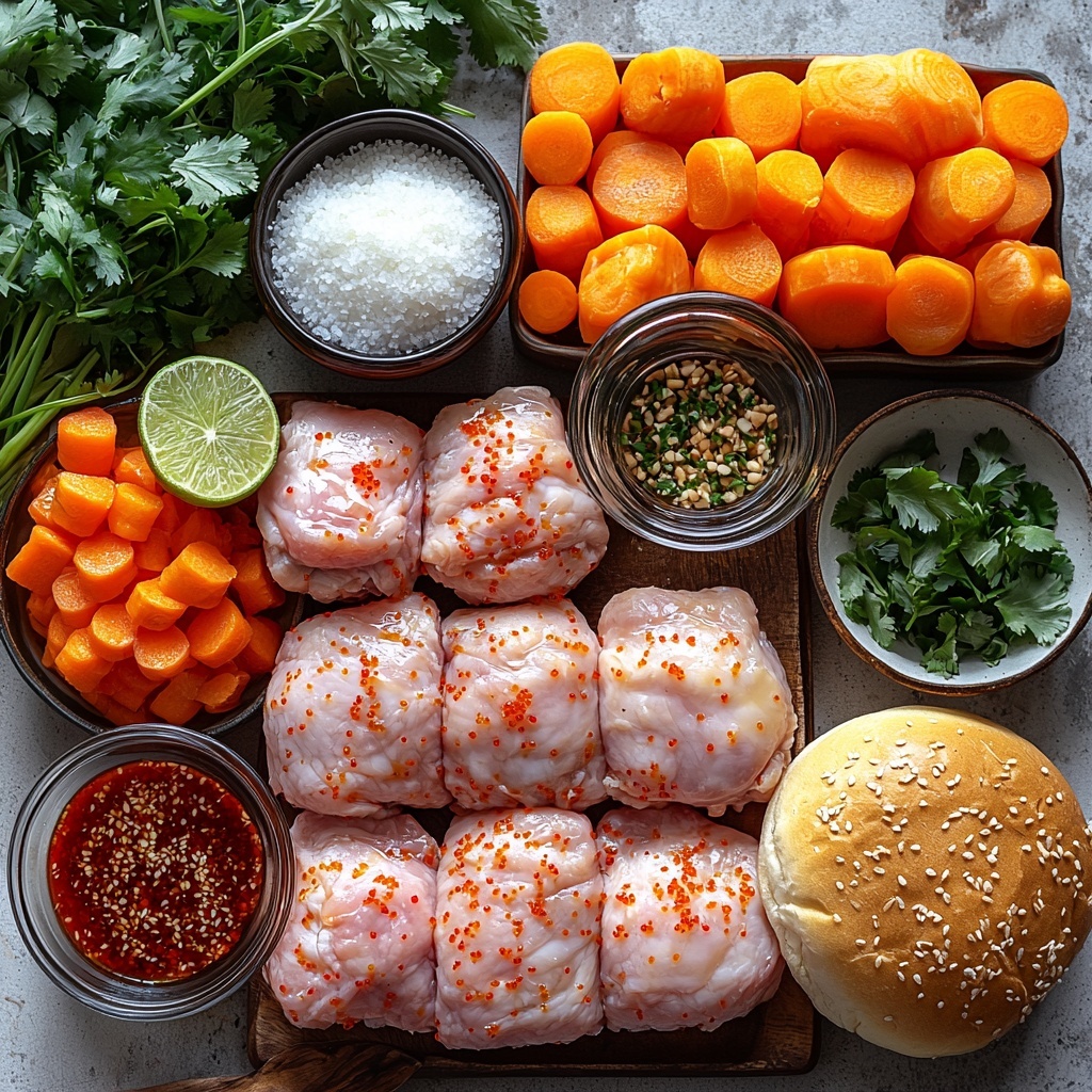 Lightly toast your brioche buns to add a gentle crunch and enhance their natural sweetness. Spread a generous layer of sriracha mayo or your preferred zesty sauce on the bottom bun—that delightful kick of heat and creaminess ties the sandwich together. Next, place a crispy chicken thigh on top, followed by a handful of pickled vegetables for bright tang and crunch, and finish with fresh cilantro and mint leaves for a burst of herbaceous freshness. Top everything with the bun crown and get ready to dive in.