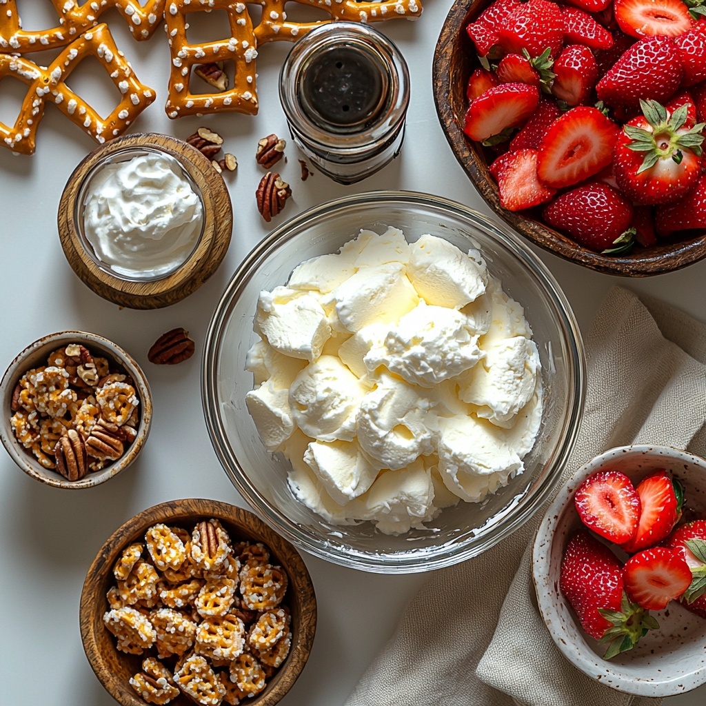 These ingredients are simple yet essential. Each one adds its own magic—from the smooth cream cheese base that gives richness, the fresh strawberries that bring vibrant color and sweetness, to the crunchy pecans and pretzels that provide that addictive texture contrast.