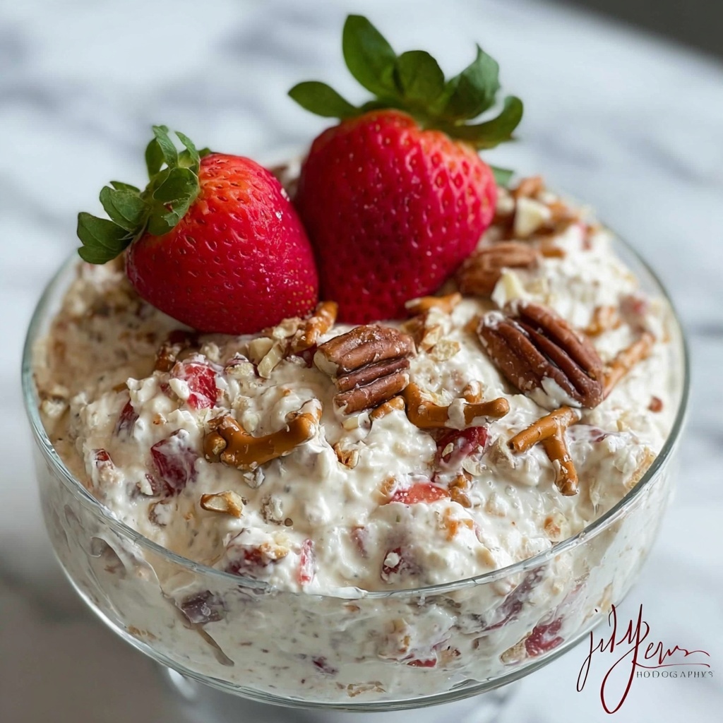 Delightful Strawberry Crack Salad is a creamy, sweet, and crunchy dessert salad featuring a luscious cream cheese and whipped topping base, fresh diced strawberries, and a caramelized pretzel and pecan crunch. This treat combines a refreshing fruitiness with a rich and buttery crunch, perfect for a quick and impressive dessert or party dish.