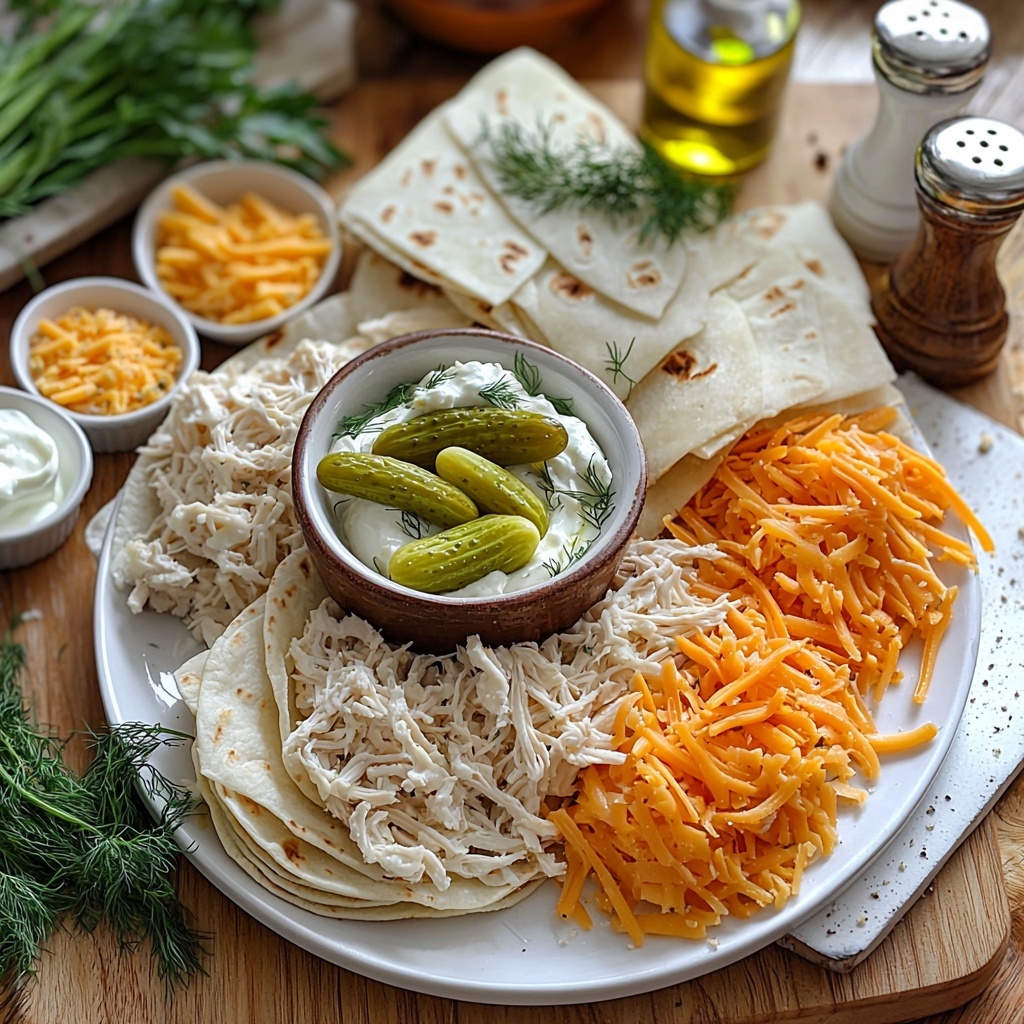 - Prepare Filling: In a large mixing bowl, thoroughly combine shredded chicken, chopped dill pickles, softened cream cheese, ranch dressing, shredded cheddar and mozzarella cheeses, chopped fresh dill, garlic powder, onion powder, salt, and black pepper until the mixture is well blended.