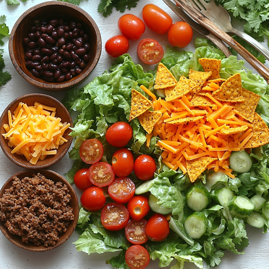 - Prepare the Salad Base: In a large salad bowl, combine the chopped Romaine lettuce, rinsed black beans, chopped or sliced tomatoes, and shredded cheddar cheese. Add the slightly cooled seasoned ground beef and gently toss everything together to mix evenly.