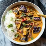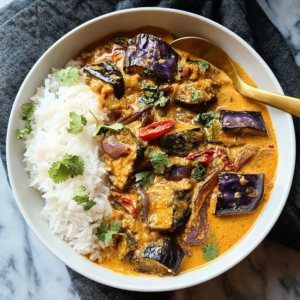 A rich and flavorful Eggplant Coconut Curry featuring tender eggplant cubes simmered in creamy coconut milk and aromatic spices. This comforting vegetarian dish is perfect for a wholesome meal and garnished with fresh cilantro for a burst of freshness.