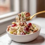 Gently fold the shredded chicken, diced apple, halved grapes, toasted pecans, and diced celery into the dressing. Stir just enough to coat everything evenly without mashing the delicate fruits. Taste and adjust with salt and pepper if desired, then chill the salad for at least 15 minutes to let the flavors harmonize.