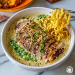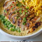 This Fiery Chicken Ramen with Creamy Garlic Sauce is a flavorful and satisfying twist on classic ramen, featuring tender chicken thighs rubbed with chili powder and paprika, immersed in a savory chicken broth enhanced with sesame oil and soy sauce, and topped with a luscious creamy garlic sauce. Garnished with green onions and a drizzle of chili oil, this dish offers a perfect balance of heat, creaminess, and umami, ideal for a warming meal.