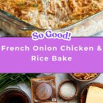 This French Onion Chicken and Rice Bake is a comforting, flavorful one-dish meal perfect for dinner. Tender chicken thighs are baked atop a savory mixture of white rice, beef and chicken broth, and French onion soup mix, then topped with melted Gruyere cheese and crispy fried onions for that classic French onion soup taste in an easy casserole form.