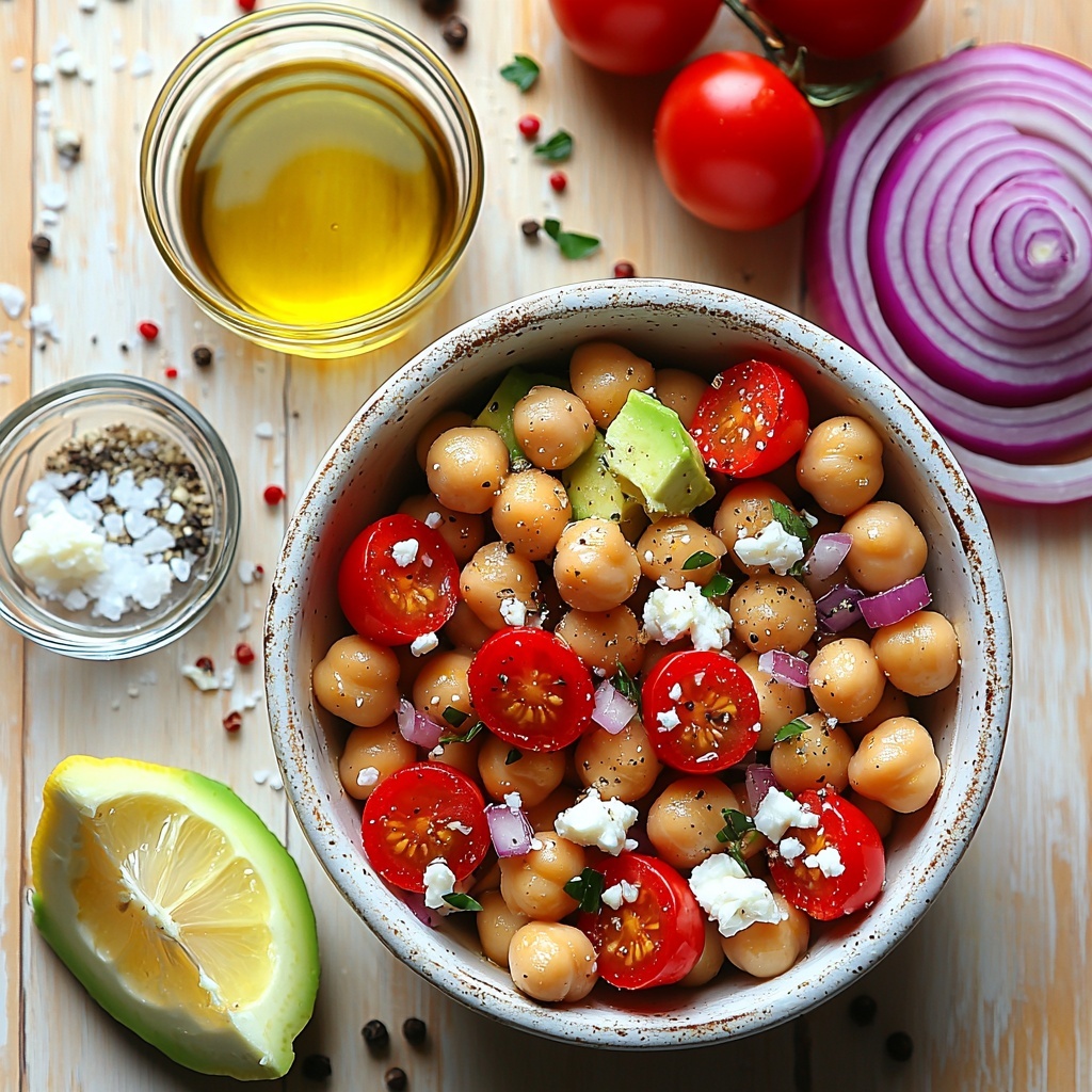 Start by tossing together the chickpeas, chopped avocado, crumbled feta, halved cherry tomatoes, and thinly sliced red onion in a large bowl. Mixing these fresh ingredients first allows you to see the vibrant colors come alive and prepare them evenly before dressing.