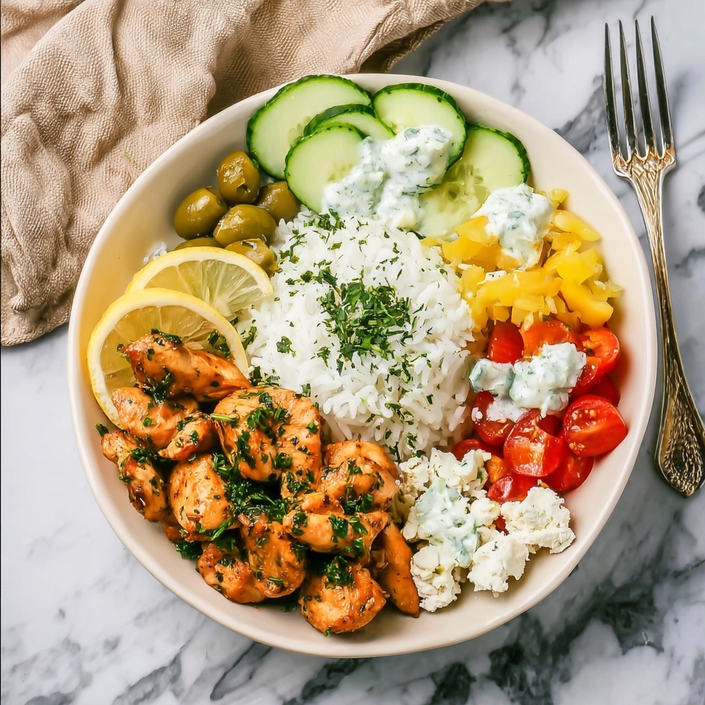 Greek Chicken Bowls are a vibrant and healthy meal featuring marinated grilled or sautéed chicken breast served with fresh cucumbers, grape tomatoes, kalamata olives, red onion, and crumbled feta cheese. These bowls are topped with a creamy homemade tzatziki sauce made from Greek yogurt, fresh dill, grated cucumber, and garlic, bringing authentic Mediterranean flavors to your table. Perfect for a quick dinner or meal prep, this recipe delivers a satisfying balance of protein, vegetables, and bright zesty notes.