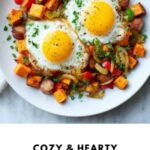 A hearty and flavorful sweet potato breakfast hash perfect for cozy mornings. This dish combines tender sweet potatoes, savory breakfast sausage, and aromatic herbs, all cooked to perfection and topped with eggs for a filling and delicious start to your day.