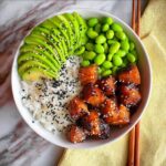 These High Protein Teriyaki Salmon Bites are a delicious and nutritious dish featuring tender salmon pieces marinated and coated in savory teriyaki sauce, then pan-seared to perfection. Garnished with toasted black sesame seeds and paired with creamy avocado, shelled edamame, and steamed rice, this quick and flavorful recipe makes for a wholesome meal that’s rich in protein and perfect for a healthy lunch or dinner.