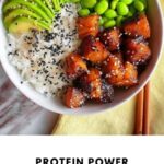 7. Assemble and Serve: Serve the teriyaki salmon bites over steamed rice alongside the shelled edamame and avocado slices. Drizzle additional teriyaki sauce over the salmon and garnish as desired for a complete, protein-rich meal.