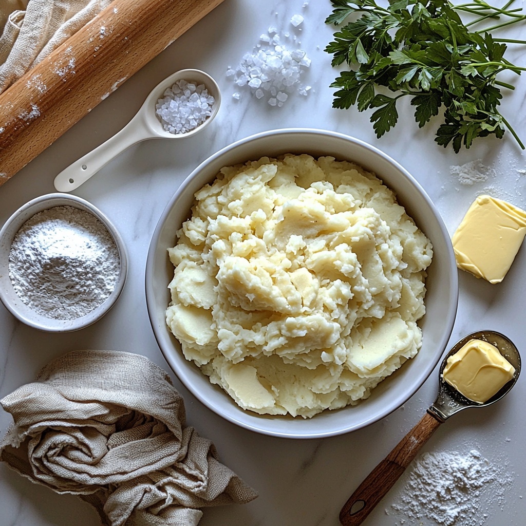 - Combine Ingredients: In a bowl, mix mashed potatoes, all-purpose flour, salt, and baking powder thoroughly until a dough forms.