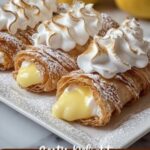 4. Add the Meringue Topping: Using a separate piping bag, pipe the prepared meringue topping over the lemon filling inside each cannoli shell, creating a decorative swirl or peak.