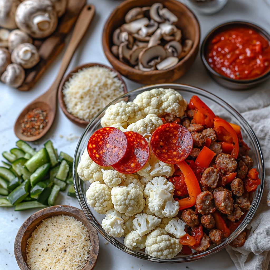 - Mix Toppings: In a large bowl, combine the steamed cauliflower, cooked Italian sausage, sautéed mushrooms, and green peppers. Toss together until well mixed.