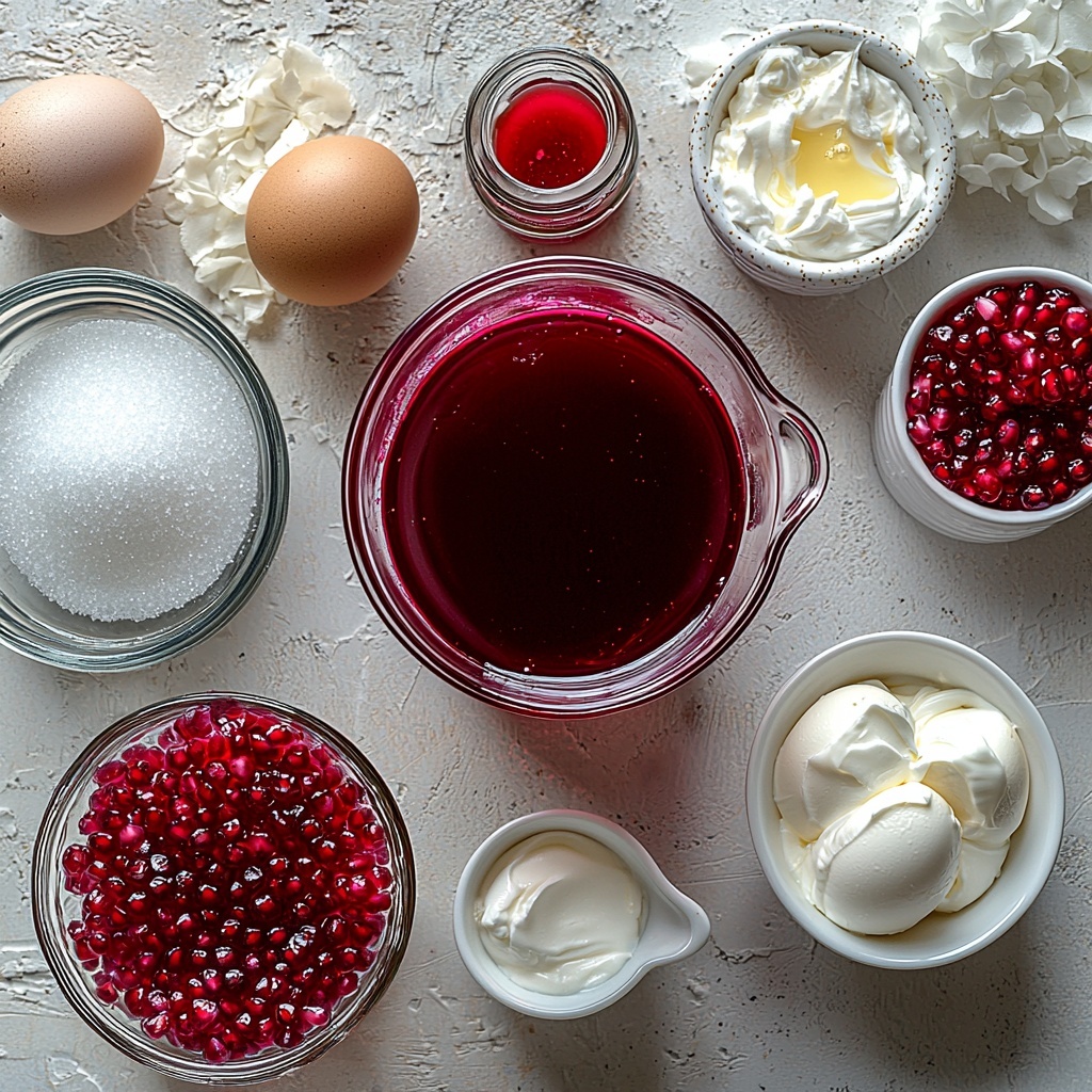 This Pomegranate Mousse Dome Recipe requires just a handful of simple yet essential ingredients. Each element plays a crucial role—from building the luscious texture to delivering that beautiful pomegranate zing and the subtle sweetness that balances it all.
