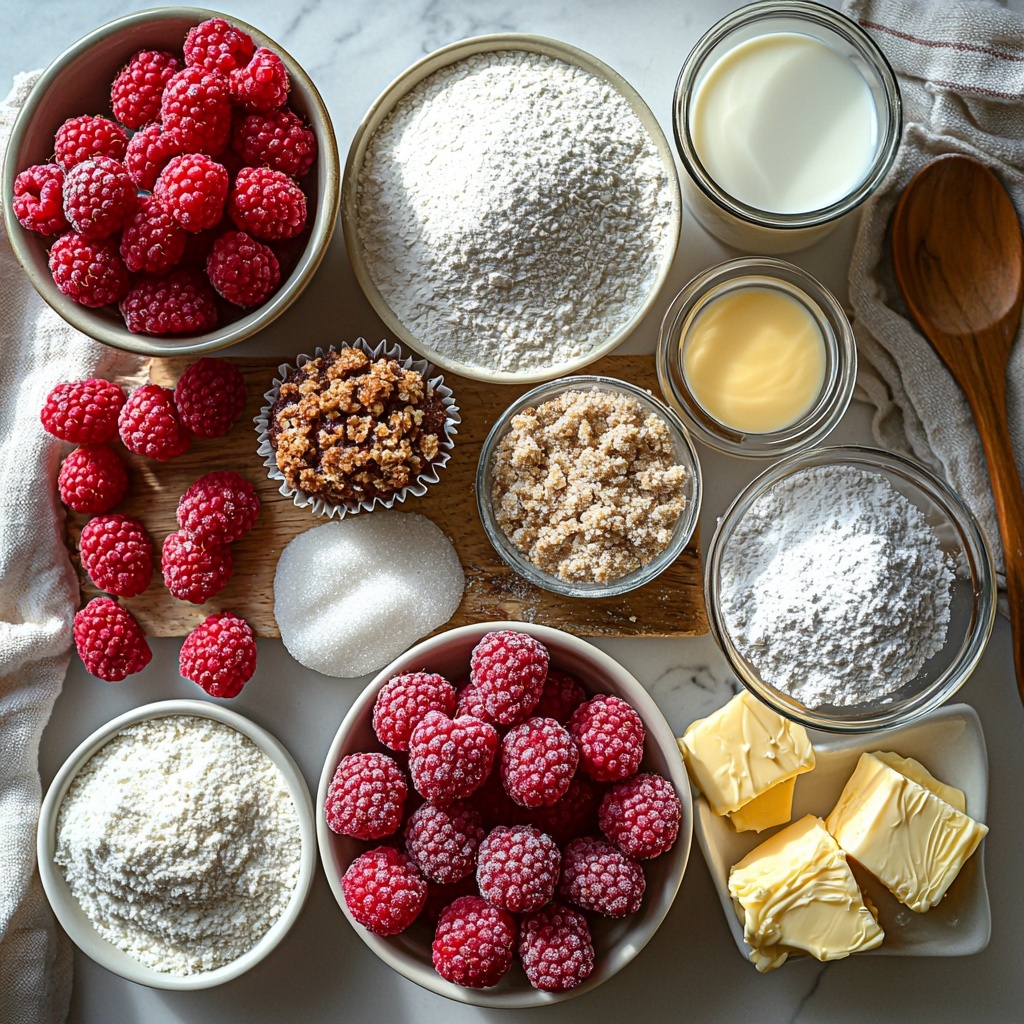 Gathering simple, pantry-friendly ingredients is the first step toward mastering this Raspberry Streusel Muffins Recipe. Each element plays a key role, from the flours that give structure, to the raspberries that add that irresistible pop of color and tartness, all the way to the streusel topping that provides delightful crunch and sweetness.