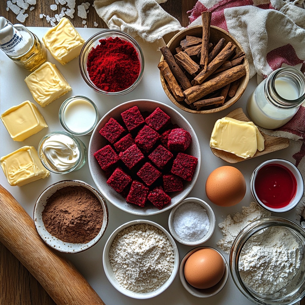 This recipe keeps things surprisingly simple with ingredients that are easy to find but essential to achieve the perfect balance of taste, texture, and that iconic red hue. Each component plays its part: from the warm milk that wakes up the yeast, to the cocoa powder giving subtle chocolate notes, and the buttery cinnamon filling that makes every swirl irresistible.