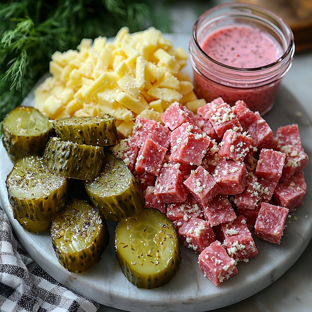 Gathering the right ingredients is the secret to making these pickle bites shine. Each element plays a crucial role in delivering the classic Reuben flavor in a cute, handheld form, while also contributing to the perfect texture and balance of taste.