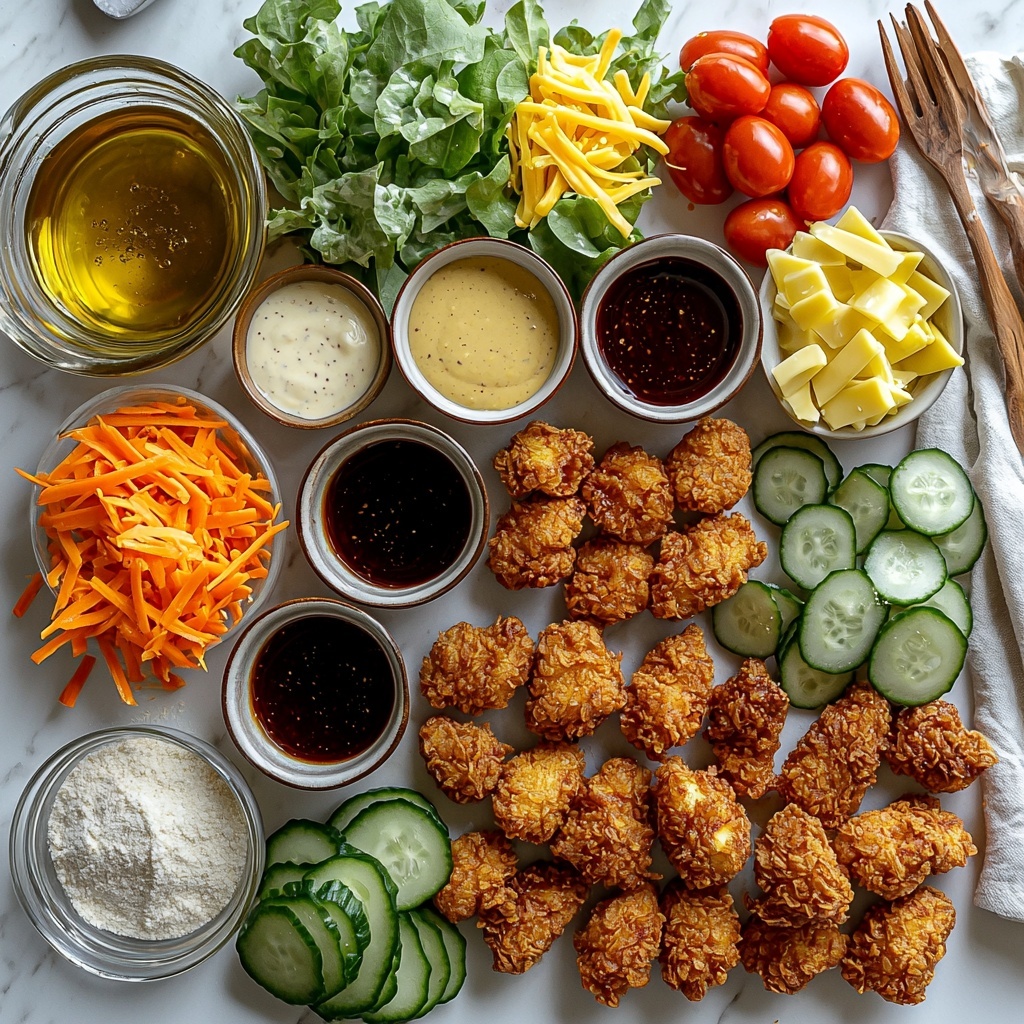 The joy of the Sticky Chicken Fingers Salad Recipe starts with simple, wholesome components that each play a unique role. From the golden crispiness of panko breadcrumbs to the vibrant freshness of romaine and crunchy carrots, every ingredient contributes texture, flavor, and color, making this dish both delicious and beautiful.