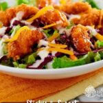 7. Serve: Divide the salad among serving bowls, top each with the sticky chicken fingers, sprinkle with shredded cheddar cheese, and drizzle ranch dressing over the top for a rich, creamy finish. Serve immediately for best texture and flavor.