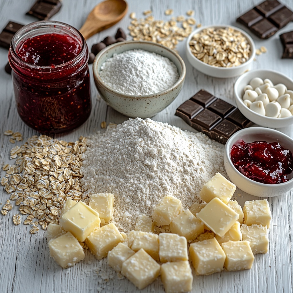 Gathering simple, pantry-friendly ingredients is the first step toward making these bars shine. Each item plays a crucial role, from the rich, buttery crust to the sweet strawberry jam that gives the bars their special zing and color, while oats and coconut add a perfect nutty crunch.
