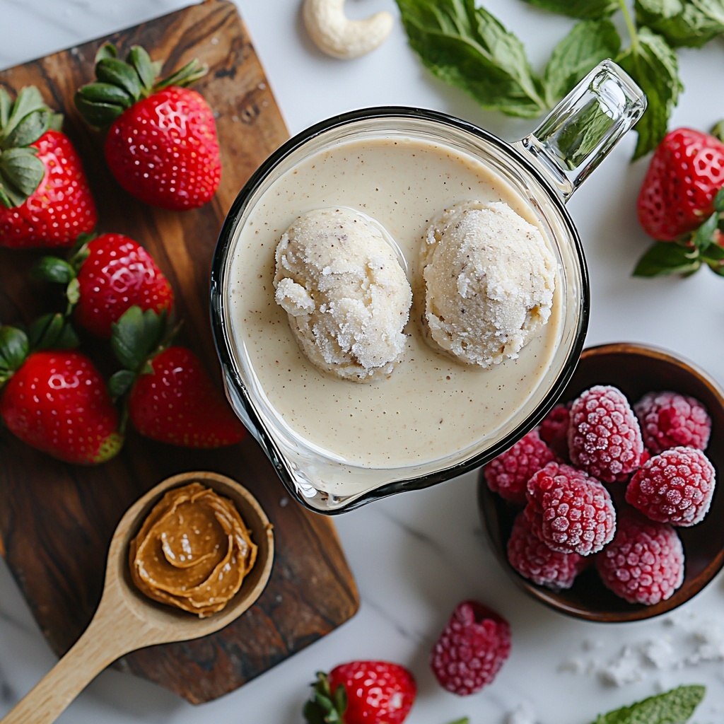 - Blend the Smoothie: Add cashew milk, frozen bananas, strawberries, raspberries, protein powder, almond butter, vanilla paste, and a pinch of salt into a high-powered blender. Start blending on low speed for 30 seconds, then gradually increase to medium-high speed and blend for an additional 2 minutes until creamy and smooth.