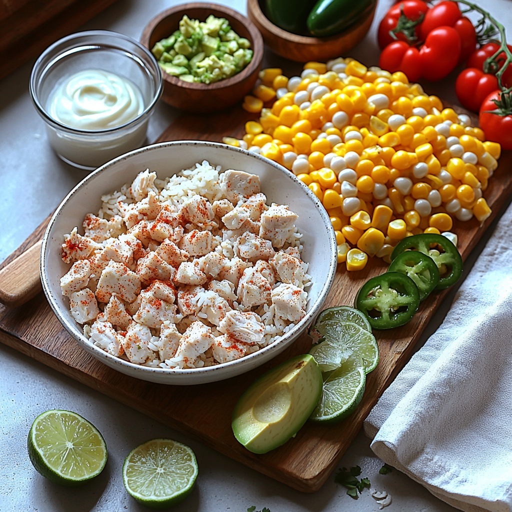 Layer the cilantro lime rice at the bottom of your bowl, add a generous portion of the spiced chicken, and top everything with a helping of the creamy street corn mixture. Finish with your favorite toppings like diced avocado, chopped tomatoes, sliced jalapeños, and a sprinkling of extra cotija cheese. Serve it warm and dig in!