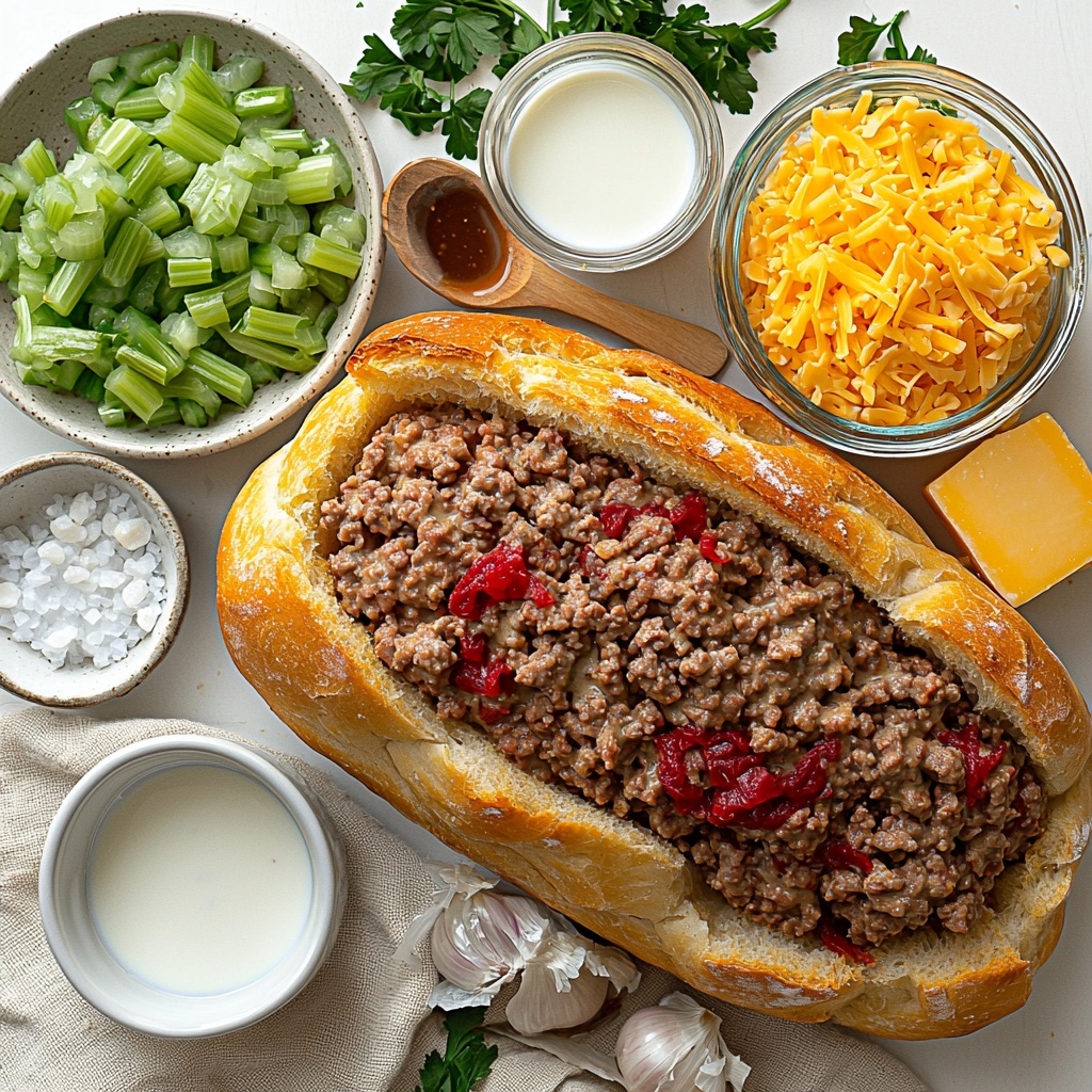 This Stuffed French Bread recipe is a comforting and hearty meal featuring a savory ground beef mixture combined with celery, creamy soup, and melted cheddar cheese, all packed inside a warm, crusty French bread loaf. Perfect for a quick weeknight dinner or a satisfying appetizer for gatherings, it’s easy to prepare and delights with its blend of flavors and textures.