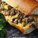 - Assemble Bread: Place the two halves of French bread on a large baking sheet. Spoon and spread the warm beef and bread mixture evenly over the bottom half of the bread. Sprinkle the shredded cheddar cheese evenly over the filling, then cover with the top half of the bread.