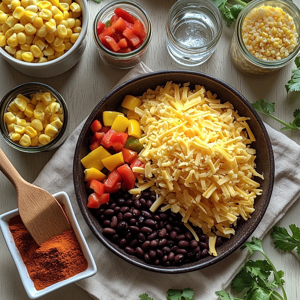 In a separate bowl, combine the black beans, corn, diced bell peppers, cumin, chili powder, and half of the shredded cheese. This mixture is loaded with texture and flavor—it’s both hearty and vibrant, with just the right amount of spice to wake up your taste buds.