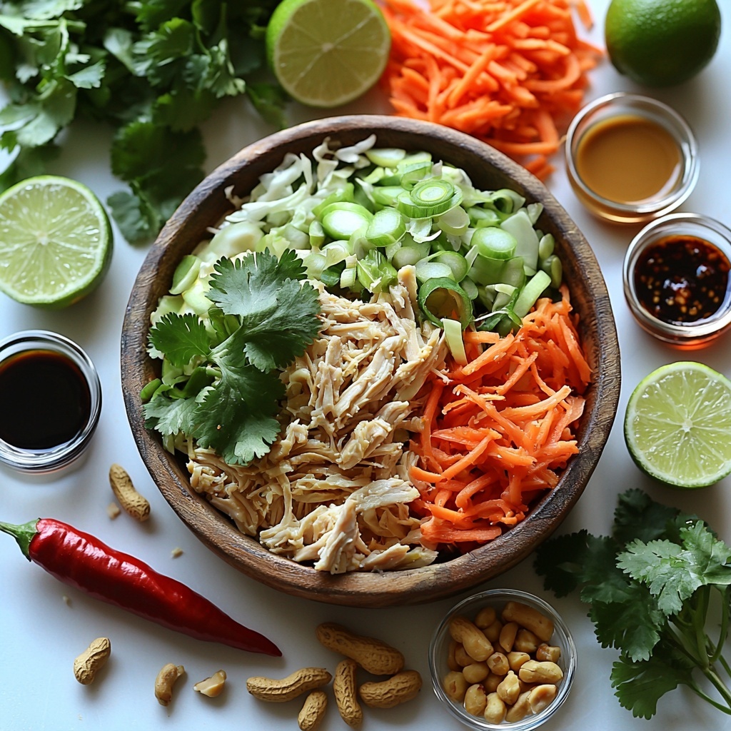 - Combine Salad Ingredients: In a large bowl, toss together the shredded cooked chicken, shredded cabbage, shredded carrots, chopped peanuts, chopped fresh cilantro, chopped green onions, and optional Thai chili peppers or jalapenos for added spice, mixing well to evenly distribute the ingredients.