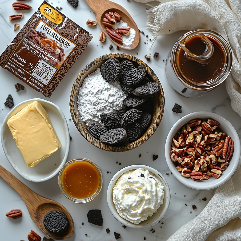 The Turtle Lush Recipe uses surprisingly simple ingredients, yet each one plays a crucial role in building its addictively creamy texture and rich, nutty flavor. From the crunchy Oreo crust to the silky pudding layers, every component is essential to create this dreamy dessert.