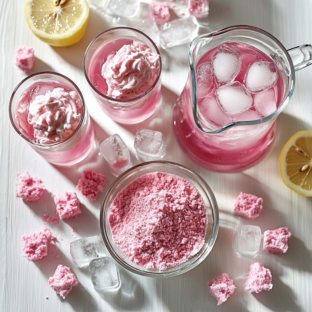 This Whipped Pink Lemonade Recipe relies on just a handful of essential ingredients that work together to deliver a perfect balance of tart, sweet, and creamy. Each ingredient plays a vital role: from the powder that gives that trademark rosy flavor and color to the heavy whipping cream that transforms the drink’s texture into something irresistibly fluffy.