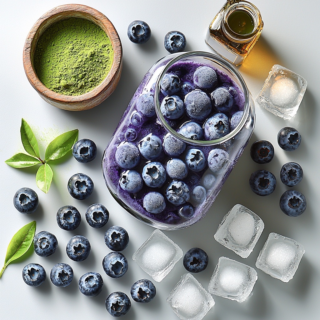 - Combine Ingredients: Add the unsweetened vanilla plant milk, frozen wild blueberries, frozen banana, matcha green tea powder, pure vanilla extract, and ice cubes into a blender.