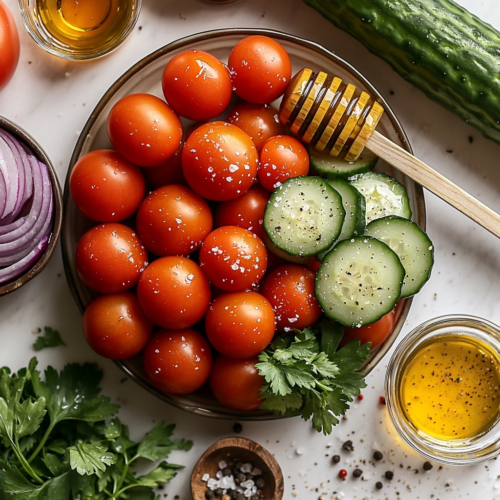 This salad is beautifully simple, built from fresh, everyday ingredients that each bring their own magic to the table. From the juicy tomatoes that provide a sweet base to the crunchy cucumbers that offer hydration and freshness, every element has its role in creating that perfect, zesty summer taste.
